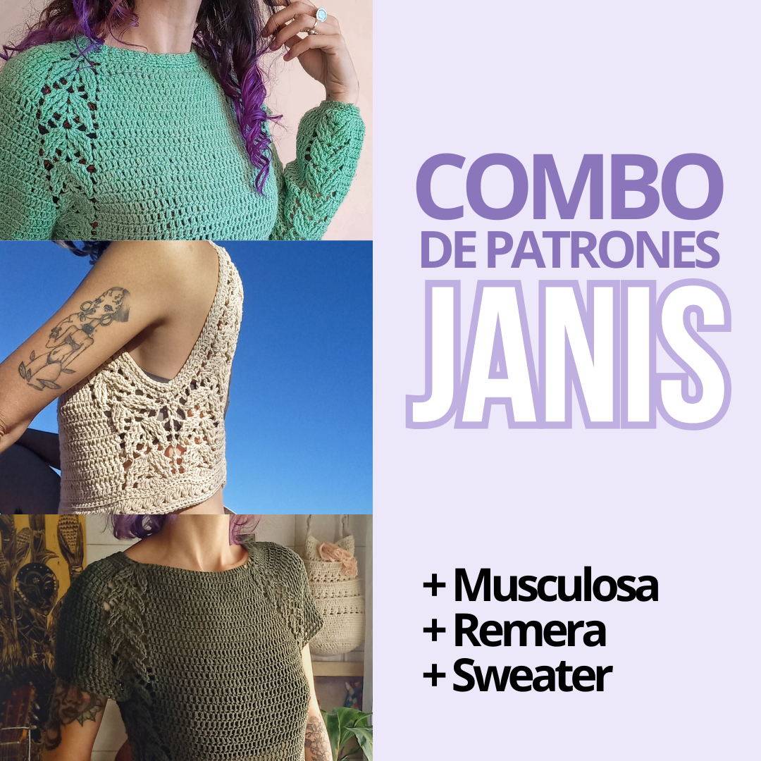 Los tres patrones incluyen fotos, videos de apoyo, tips y mucha información para que puedas tejer todas las versiones de Janis sin dificultades. Te cuento todos los secretos para que puedas tejerla en la medida que quieras con una terminación y un calce impecable. Si queres una estructura entretenida y diferente, si queres divertirte en el proceso y aprender mucho… este combo es para vos!
